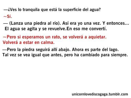 -Por favor, no seas paternalista conmigo, es cierto que vivo con mis padres y me emborracho con media cerveza y sí, admito que mi vida estaba yendo ligeramente a la deriva pero no soy un completo idiota, yo sé lo que siento por ti, eres tú la que no sabe lo que siente por mí, ojalá tuvieras el valor para decirlo.